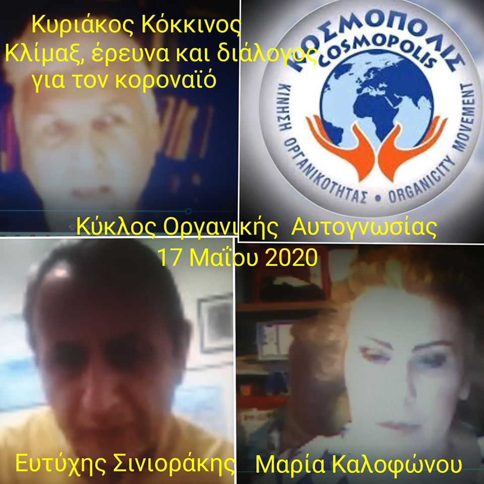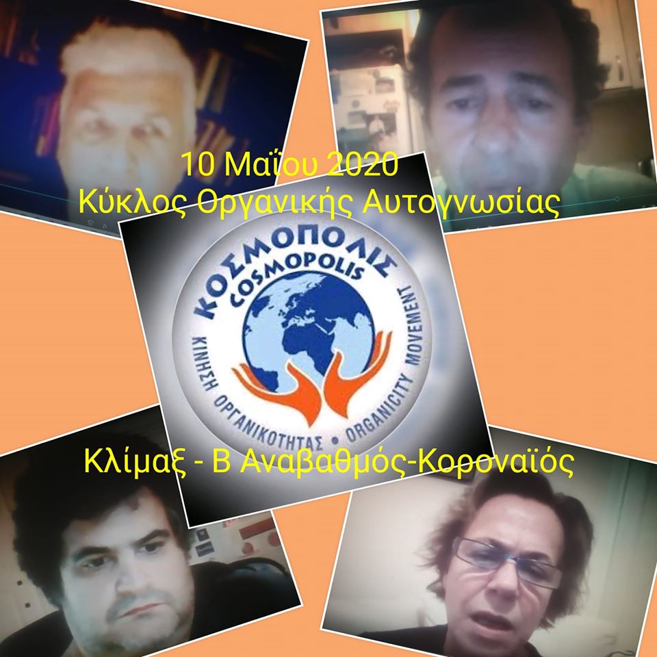 Άλλες δύο μοναδικές συναντήσεις του Κύκλου Οργανικής Αυτογνωσίας της Κίνησης Οργανικότητας ΚΟΣΜΟΠΟΛΙΣ, που διευθύνει διαδικτυακά ο Δικηγόρος, Coach και πρόεδρός της Κυριάκος Κόκκινος, ολοκληρώθηκαν τις Κυριακές, 10 και 17 Μαΐου 2020, αφιερωμένες στους 3 πρώτους αναβαθμούς της ΚΛΙΜΑΚΑΣ του Αγίου Ιωάννη Σιναϊτη σε συνδυασμό με την τρέχουσα επικαιρότητα και την έρευνα, που ξεκινήσαμε στο ΚΟΣΜΟΠΟΛΙΣ για τα ζητήματα που αφορούν τον κοροναϊό και το πώς επηρεάζει τις ζωές μας, μετά από πρόταση του Σταύρου Τσογκανή, που αποδεχθήκαμε. Η μελέτη των σχετικών ζητημάτων θα επιχειρηθεί κατά συστημικό και συστηματικό τρόπο, φωτίζοντας όλες τις δυνατές πτυχές του θέματος. Την Κυριακή, 17/5/2020, ξεκινήσαμε με μία σύντομη εισήγηση στις γενικές πτυχές του ζητήματος από τον ίδιο τον προτείνοντα Σταύρο Τσογκανή και κατόπιν ακούσαμε τα όσα είχαν να μοιραστούν μαζί μας, από πλευράς γνώσεων και εμπειρίας, αλλά και ως άνθρωποι που ζουν με τα αυτά προβλήματα, ενδιαφέροντα και ανάγκες όπως όλοι μας, εκλεκτοί επαγγελματίες του χώρου της υγείας της πρώτης γραμμής σε νοσοκομεία αναφοράς για τον κοροναϊό και συγκεκριμένα: