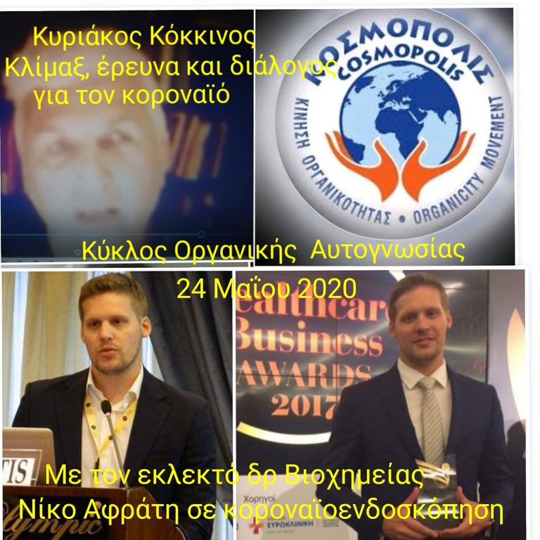 Συνεχίστηκε με απόλυτη επιτυχία ο «Διαδικτυακός Κύκλος Οργανικής Αυτογνωσίας» της Κίνησης Οργανικότητας ΚΟΣΜΟΠΟΛΙΣ, που διευθύνει διαδικτυακά ο Δικηγόρος, Coach και πρόεδρός της Κυριάκος Κόκκινος, την Κυριακή, 24 Μαΐου 2020, με καλεσμένo το διακεκριμένο δρ Βιοχημείας Νίκο Αφράτη, ο οποίος με επιστημονικό, αλλά απόλυτα κατανοητό τρόπο, μας έδωσε σημαντικές πληροφορίες αναφορικά με τις ιδιαιτερότητες του Covid19, έναντι άλλων μορφών κοροναϊών, τις έρευνες που γίνονταν στο παρελθόν και την άποψη της επιστημονικής κοινότητας για το αν είναι τεχνητός ή φυσική εξέλιξη κάποιας μορφής κοροναϊού, τις διεθνείς έρευνες ανάπτυξης αντιμέτρων και πολλά άλλα.