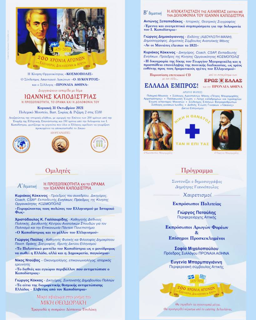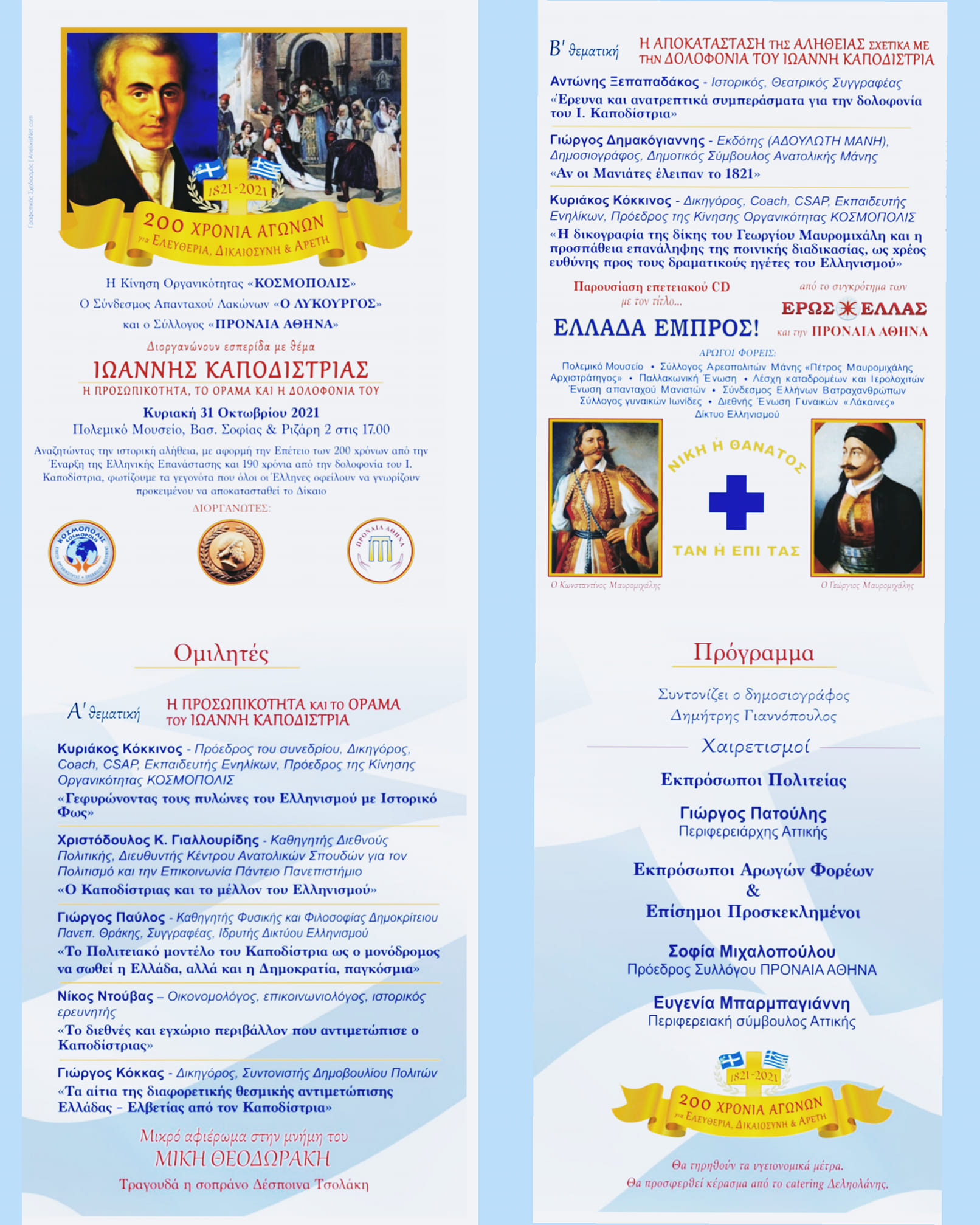 Η Κίνηση Οργανικότητας ΚΟΣΜΟΠΟΛΙΣ, ο Σύνδεσμος Απανταχού Λακώνων ο ΛΥΚΟΥΡΓΟΣ και ο Σύλλογος ΠΡΟΝΑΙΑ ΑΘΗΝΑ, τολμούν να ανοίξουν την ιστορική πληγή του Ελληνισμού, να φωτίσουν τα μουχλιασμένα και σκοτεινά υπόγεια της δολιότητας και να φέρουν πνεύμα αισιοδοξίας, ελπίδας, δύναμης και ενότητας σε όλον τον Ελληνισμό, που εορτάζει τα 200 χρόνια της έναρξης των αγώνων του, «ερήμην του» και χωρίς αναφορές ουσίας!!!